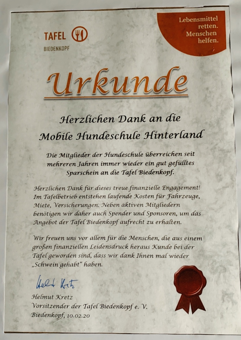 Heute erhielten wir diese Urkunde von der Tafel Biedenkopf. Über diesen besonderen Dank haben wir uns sehr gefreut.